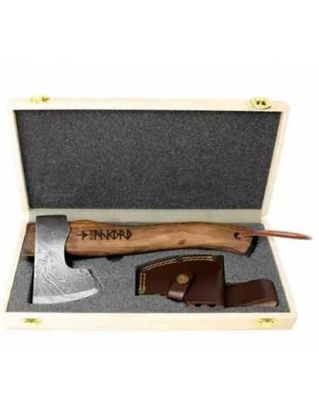 Su empuñadura ergonómica garantiza un agarre cómodo y seguro, mientras que el diseño equilibrado reduce la fatiga durante el uso prolongado. Además, incluye un estuche rígido y una funda protectora, perfectos para transportar el hacha de forma segura y preservar el filo y el acabado del acero damasquinado.