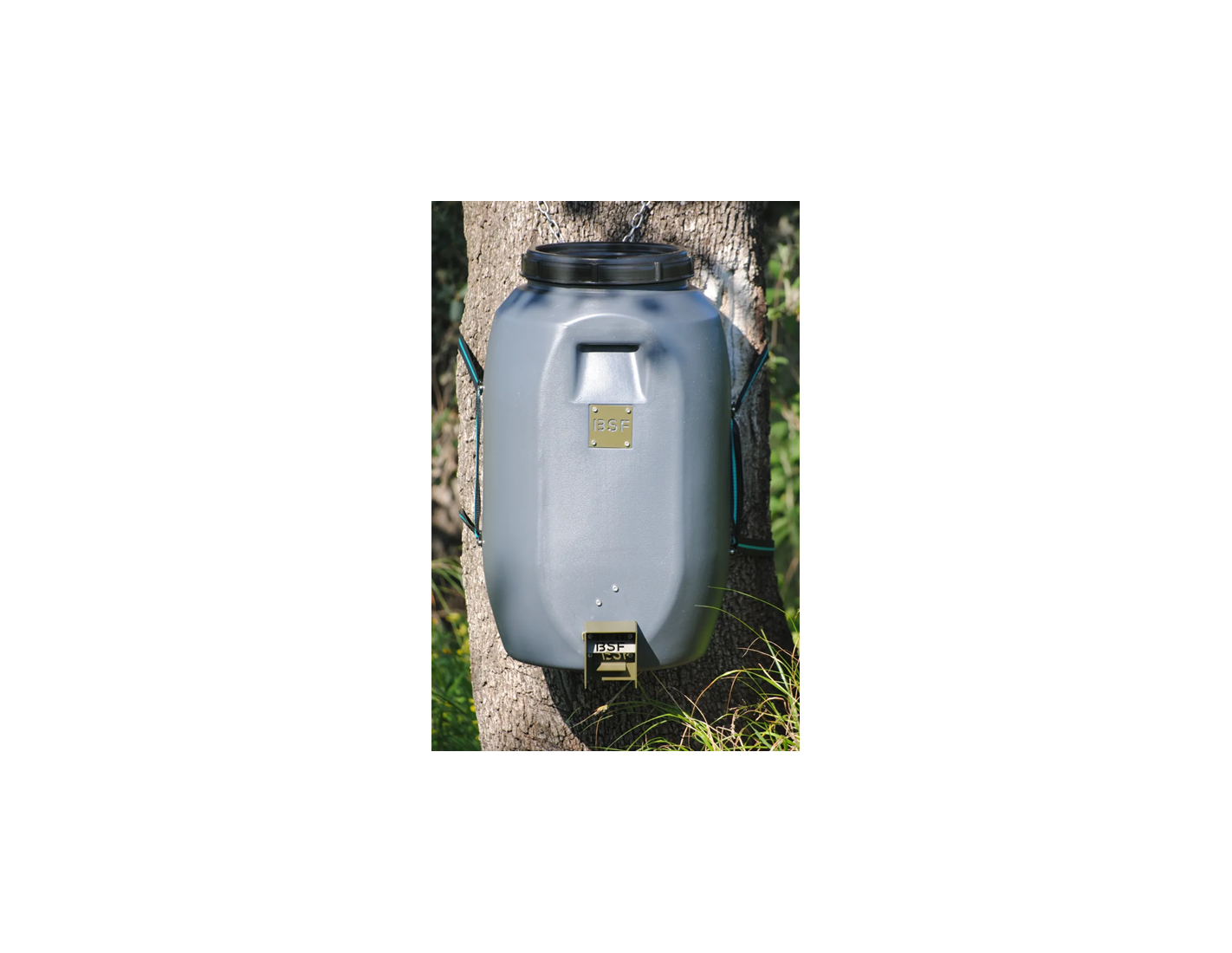 Bidón comedero de 60L con trampilla y anillas, práctico, resistente y fácil de usar. Ideal para alimentación de animales.