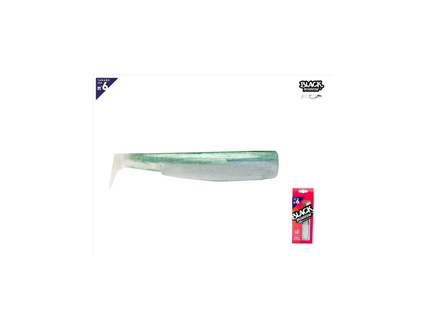 Pack de 2 cuerpos Black Minnow 200 mm en color Green Glitter. Repuestos realistas y efectivos para grandes depredadores.