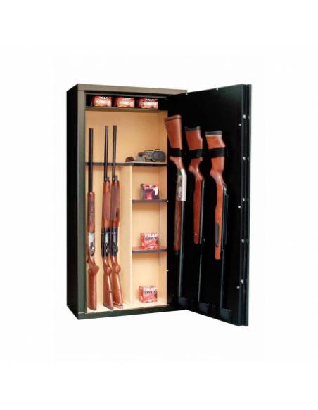 El interior incluye separadores acolchados y respaldos protegidos que evitan rozaduras en las culatas, además de estantes o bandejas superiores para guardar cajas de munición y accesorios. Su diseño permite anclaje al suelo o pared para mayor seguridad y estabilidad, y cuenta con ventilación y pintura antihumedad para proteger el contenido frente a la corrosión.
