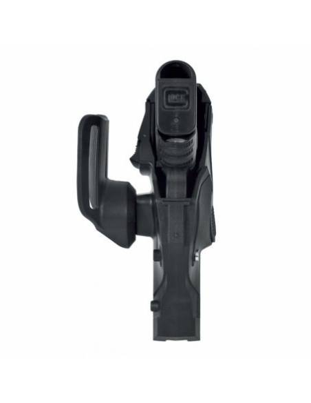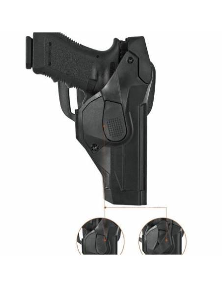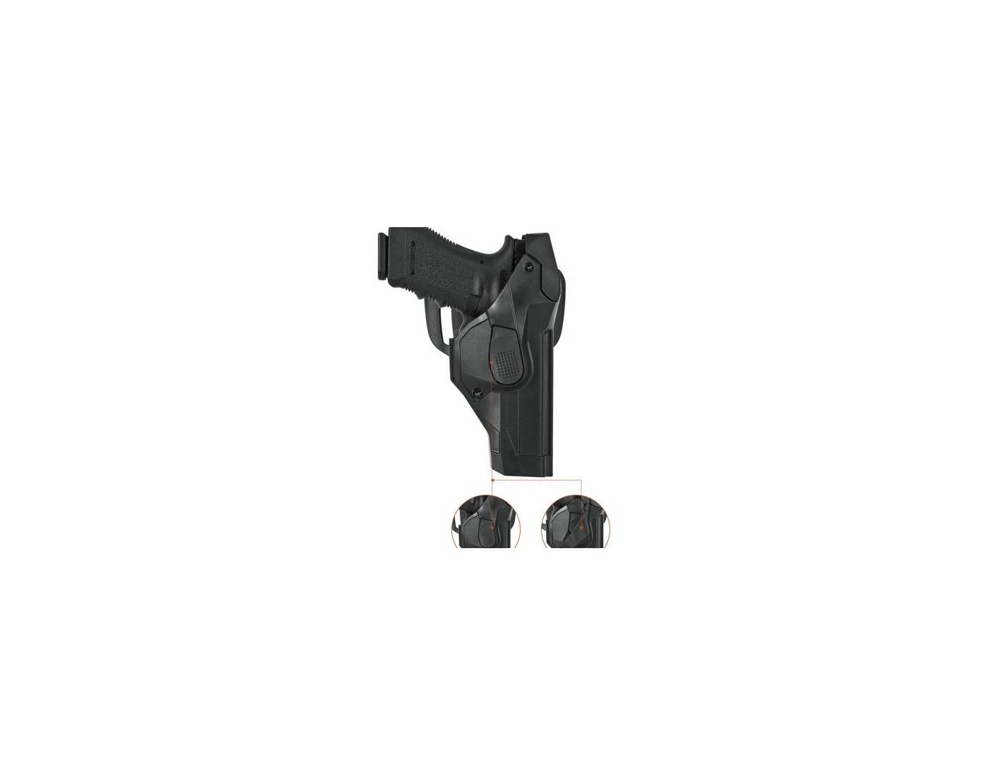 Su diseño ajustado es compatible con los modelos Glock 17 y 19, asegurando un encaje firme y seguro. Cuenta con un sistema de retención confiable, facilitando un desenfunde rápido y seguro cuando se requiere. Además, su estructura rígida permite transporte discreto y seguro, ideal tanto para profesionales de seguridad como para tiradores deportivos que buscan proteger su arma durante el transporte.