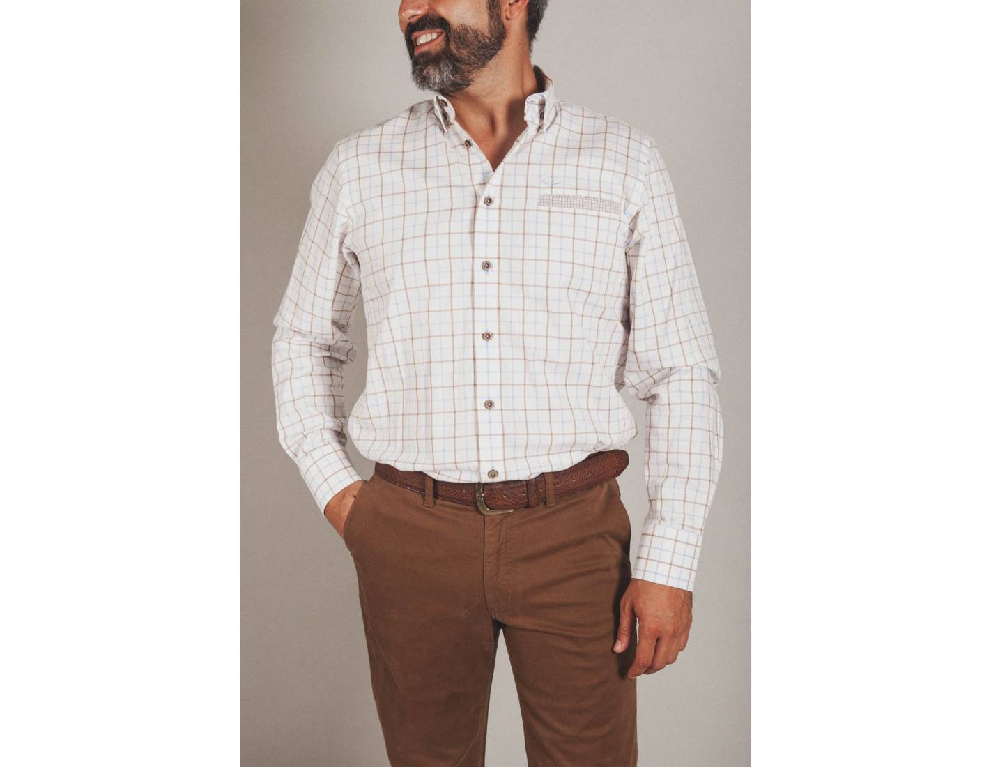 Camisa caza hombre cuadros grandes confeccionada en tejido Oxford 100% Algodón. Corte regular con tablón en espalda. Cuello clásico con botón oculto y traba en contraste. Bolsillo en delantero de un vivo en contraste. Bordado en delantero. Manga larga terminada en puño con un botón, acabado en ángulo. Detalles en contraste interior de tirilla, interior de puños y mosca en costados.