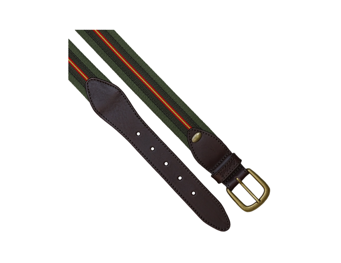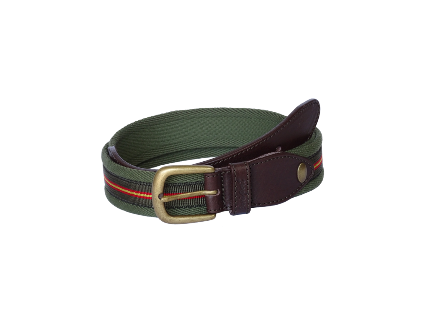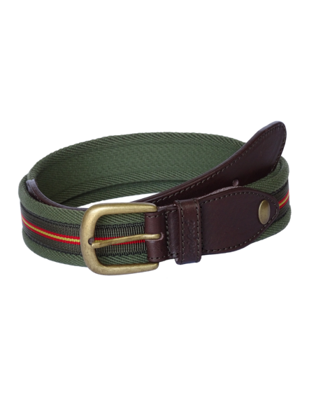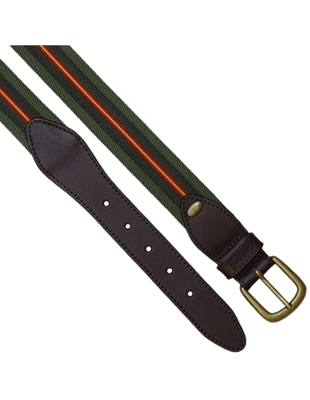 Cinturón de loneta color caqui con detalle de bandera. Resistente, cómodo y con estilo para uso diario o de caza.