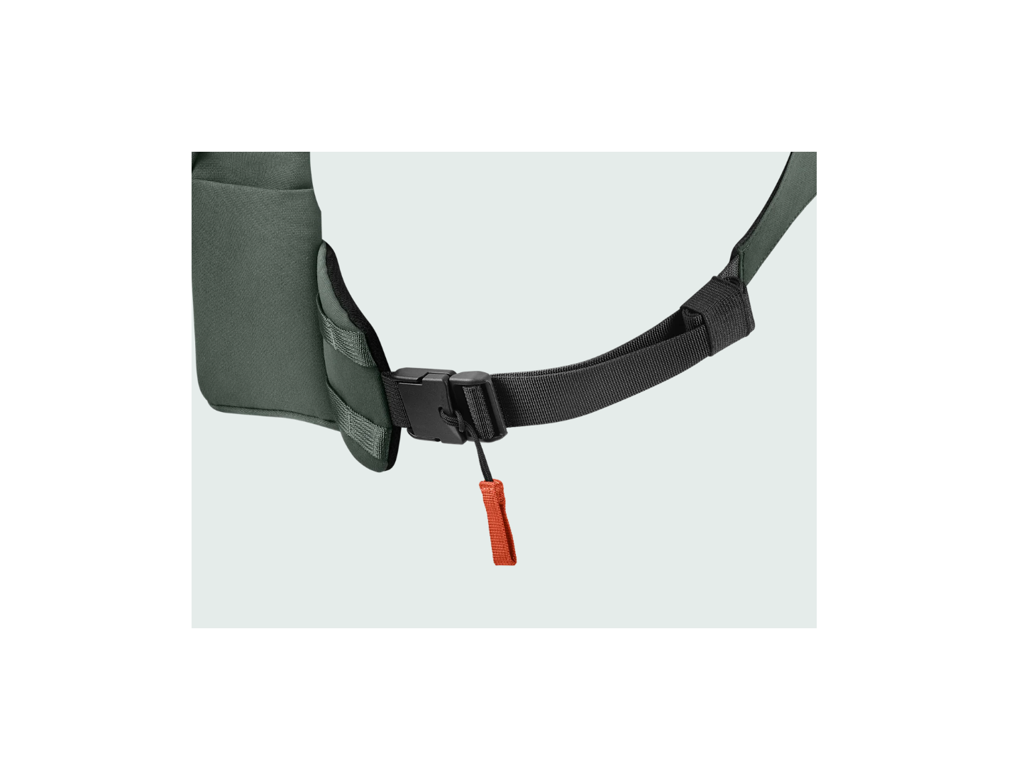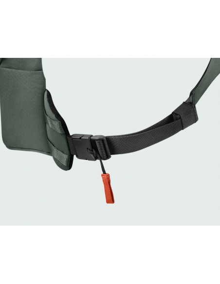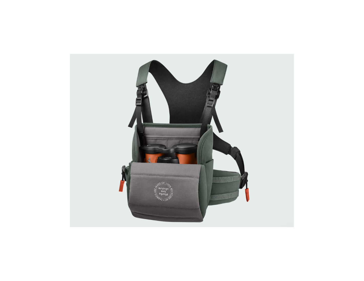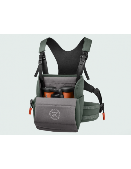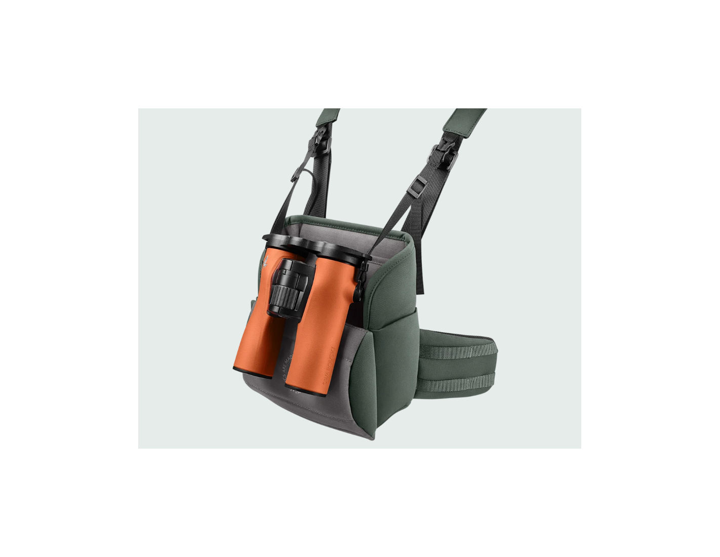 Tanto si va corriendo como a gatas o en cuclillas, el arnés mantiene sus binoculares firmemente en su sitio. Además, cuenta con una correa adicional a cada lado para garantizar que sus binoculares estén seguros en todo momento. En los dos compartimentos laterales puede guardar además objetos pequeños de forma rápida y segura.