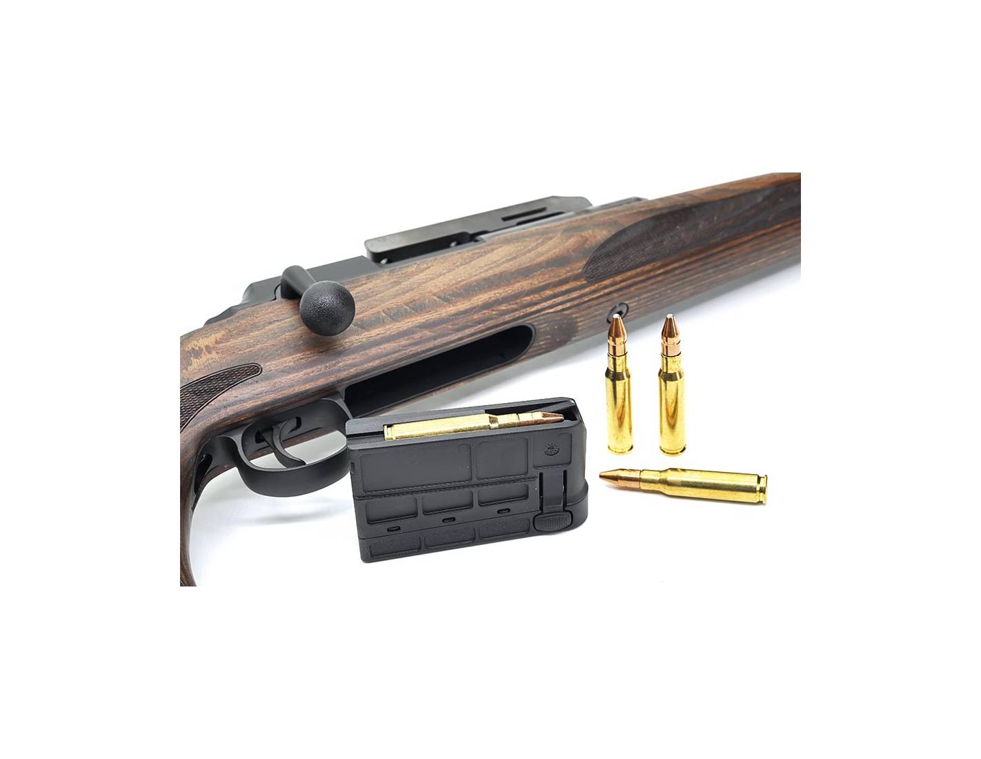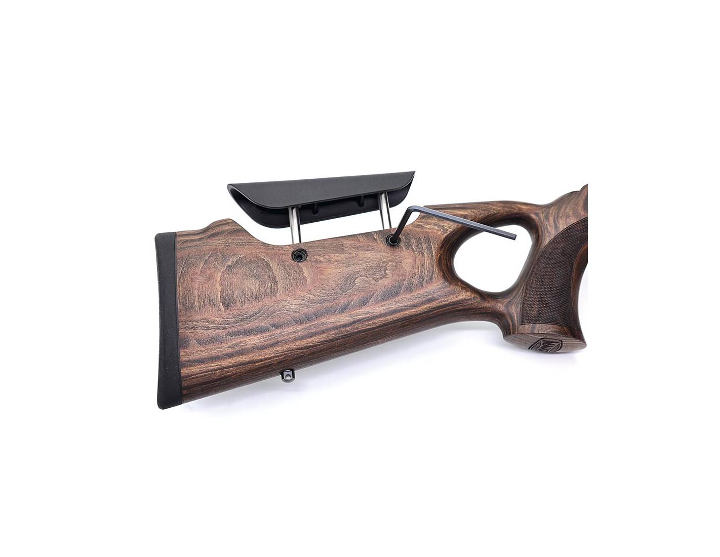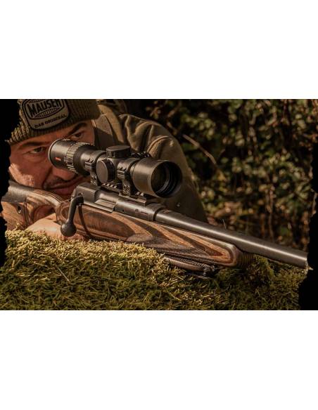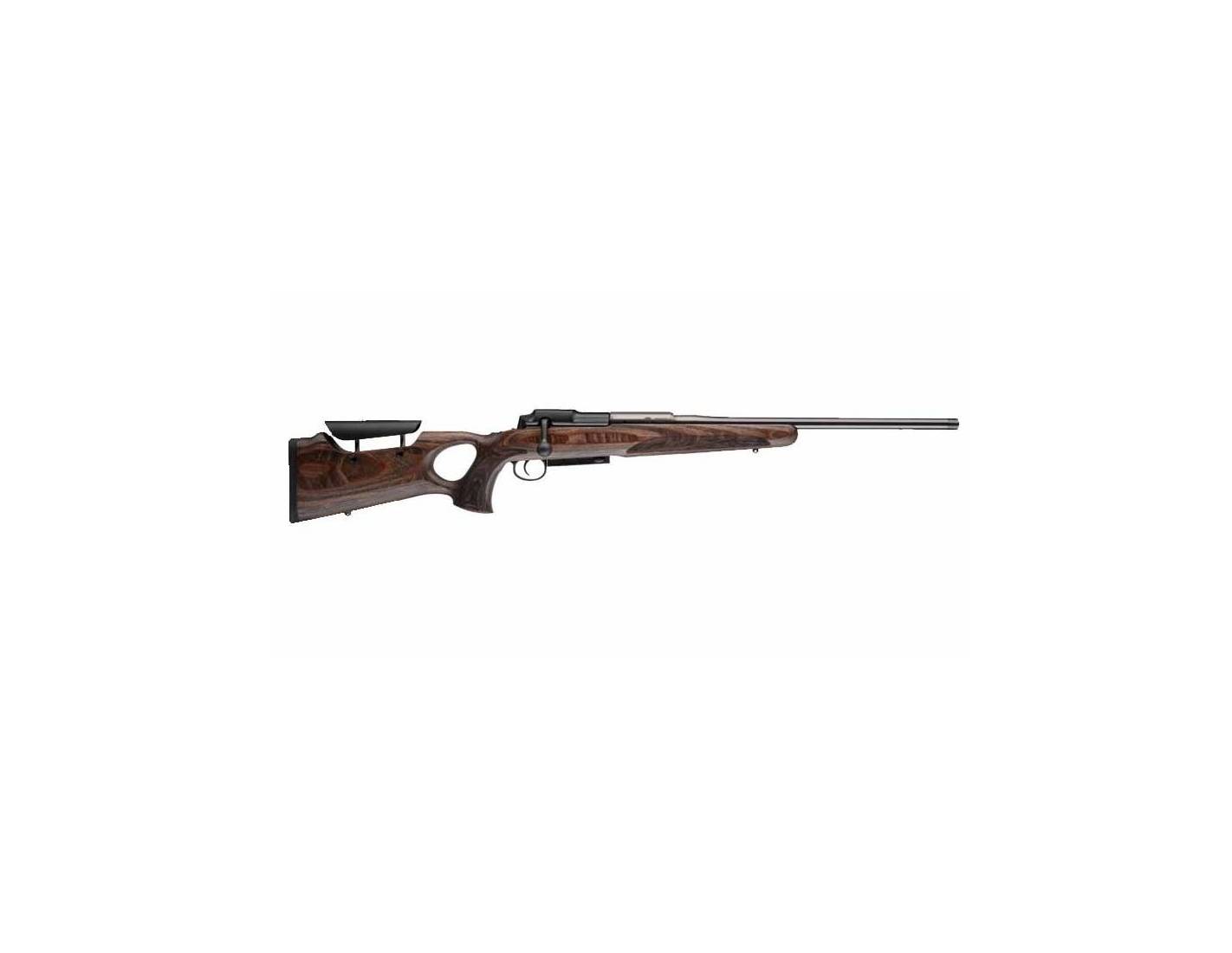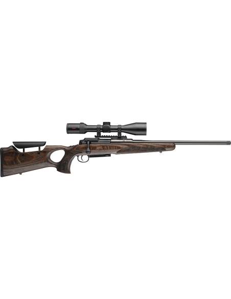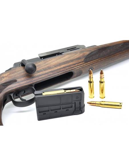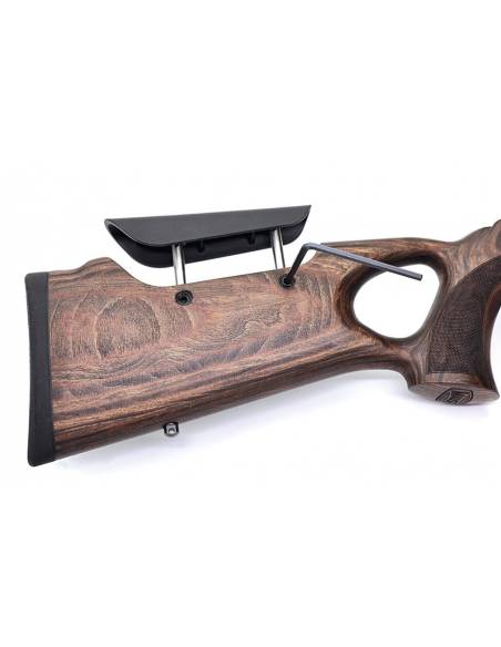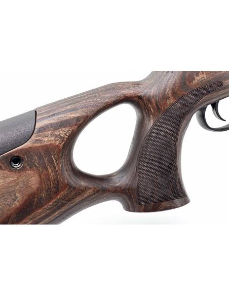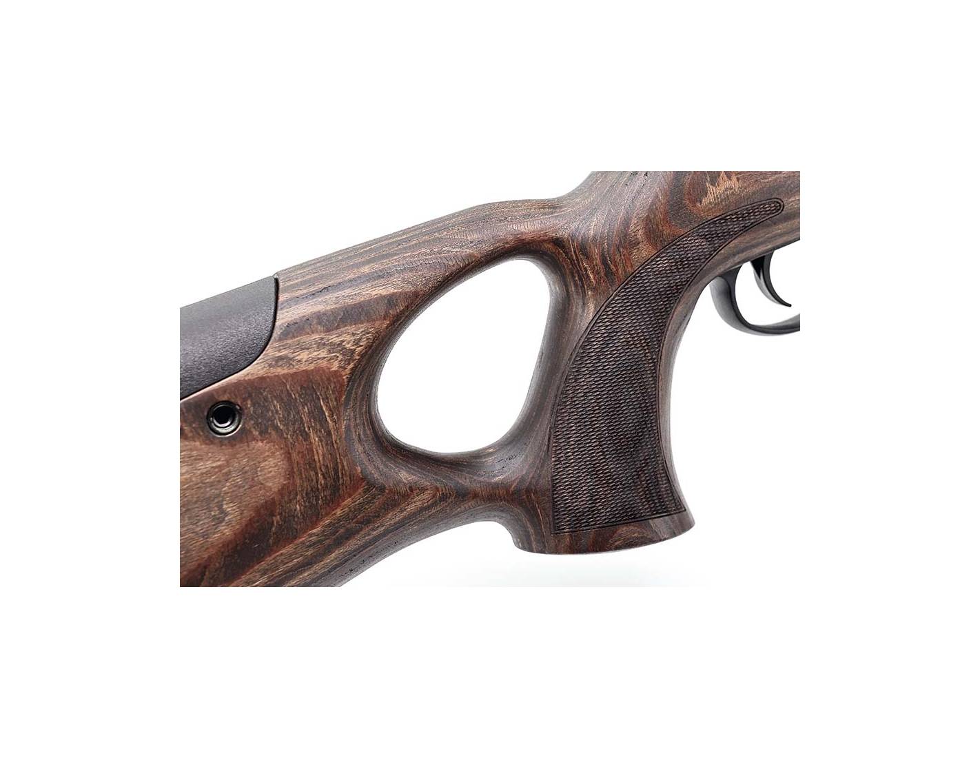 Culata thumbhole de madera laminada con carrillera ajustable, rosca de cañón M15x1, cargador sintético extraible de una hilera, cañón oxidado por plasma.
