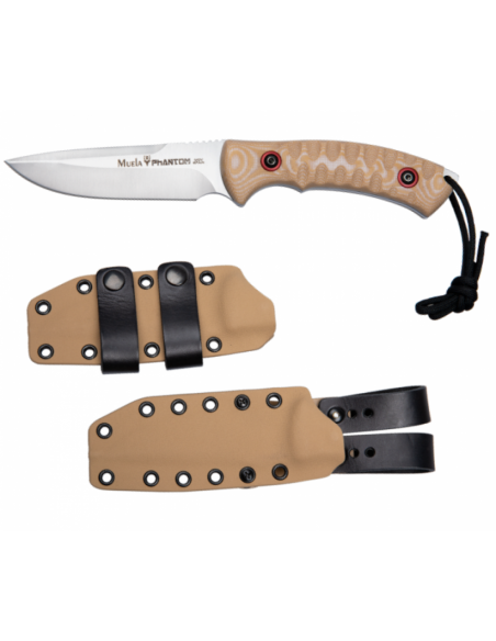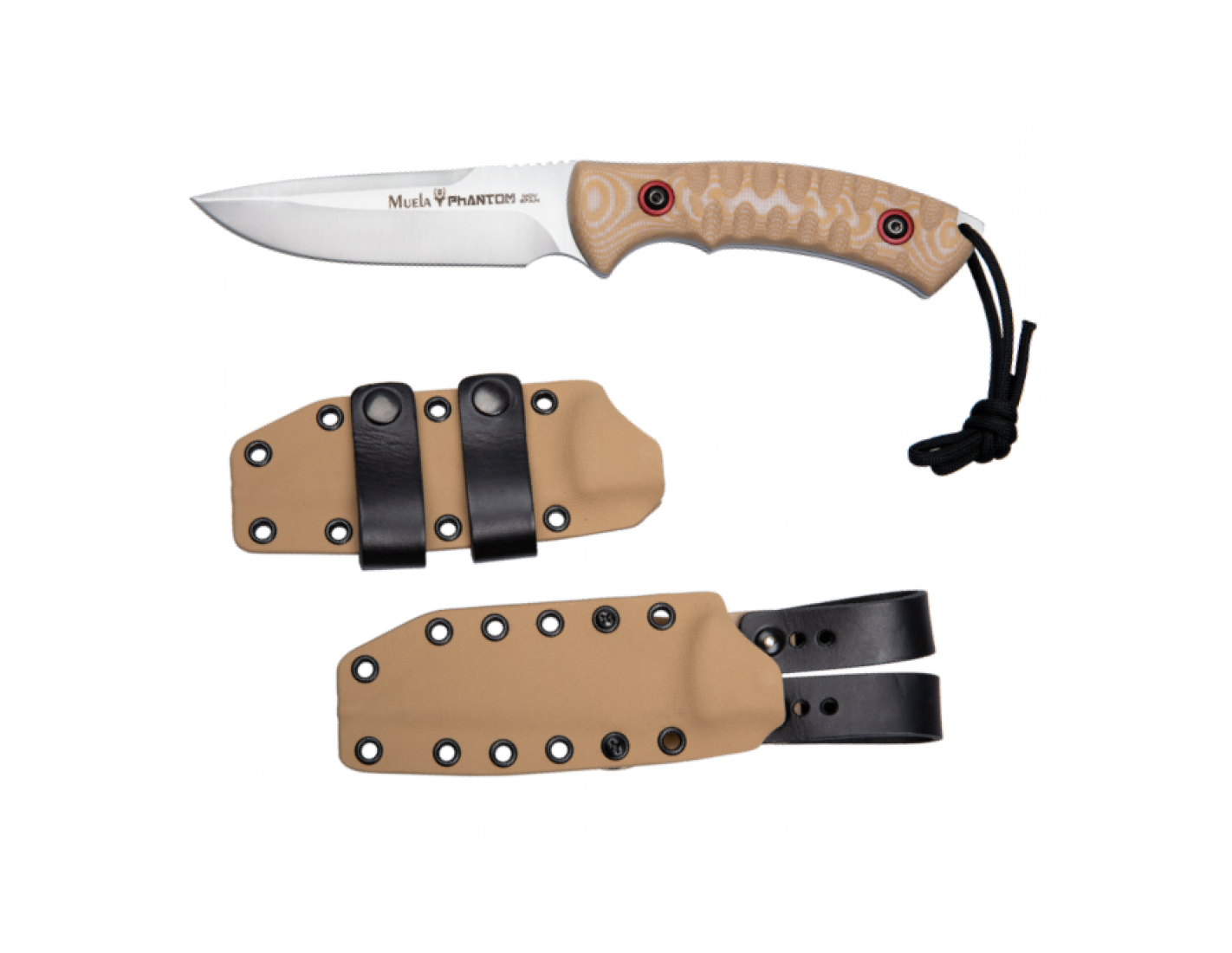 Cuchillo Muela Phantom 12D/K con hoja de acero inoxidable 1.4116 con dureza de 56-58 hrc, empuñadura con cachas de micarta desert con separadores negros, tamaño de hoja 12 cm, mango 12,5 cm, grosor de hoja 4 mm, peso 239 grs. con funda de kydex multiposición color arena desmontable.