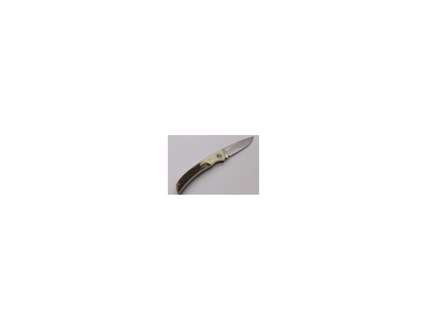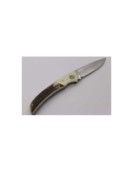 Navaja de monte de la casa MUDELA con mango de Asta de ciervo y micarta marfil, muelle de pistón decorado y hoja de acero inox 380 Mova de 8,4 cm de longitud.