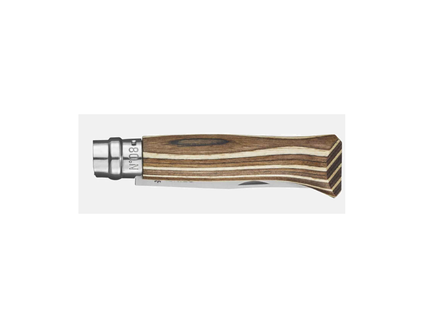 Navaja  Opinel Nº8 Abedul Laminado Marron con hoja de acero inoxidable 12c27 Sandvik con acabado satinado.
