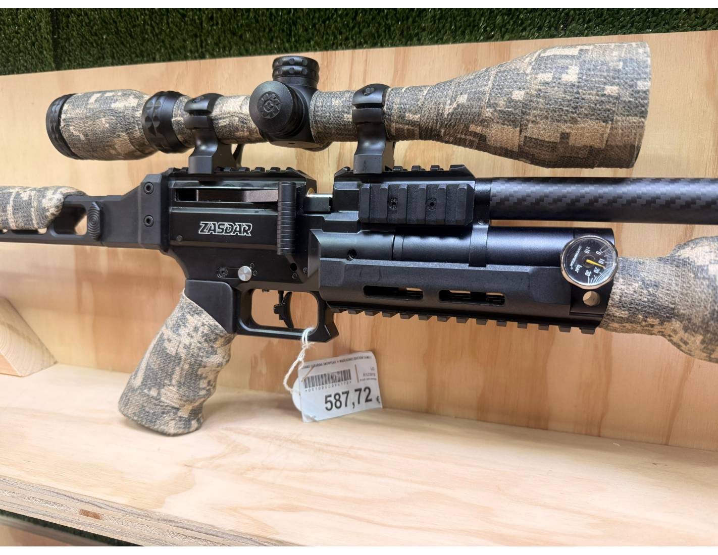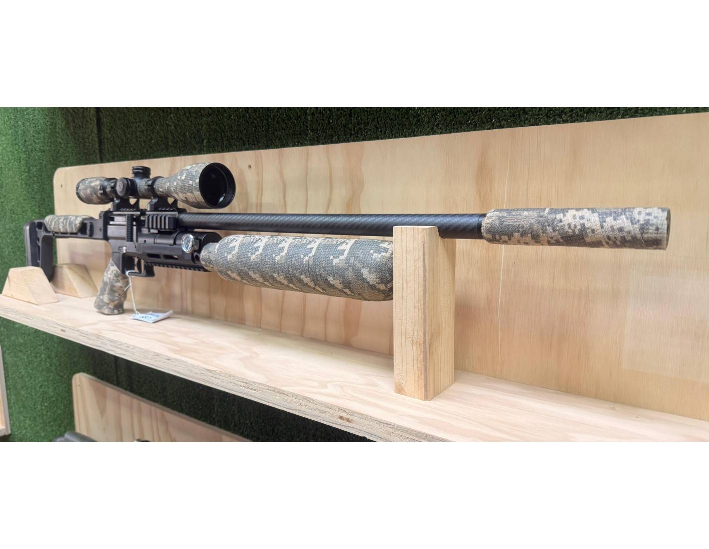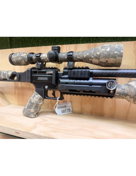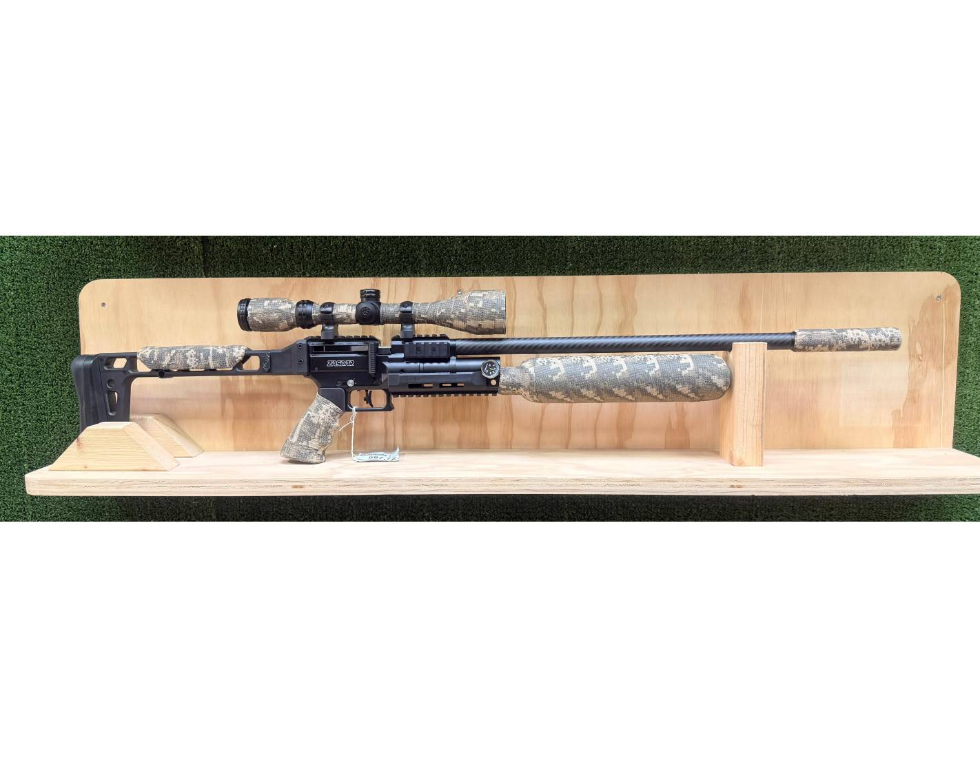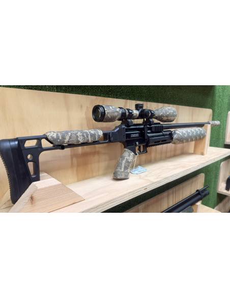 Novedoso Rifle PCP regulado con ≤24 Julios de Potencia, supresor de sonido integrado y depósito con capacidad de 250 cc a 250 bares de presión máxima. Culata ergonómica y abatible, gatillo ajustable, cargadores en monotiro y multitiro. Precisión al mejor precio.