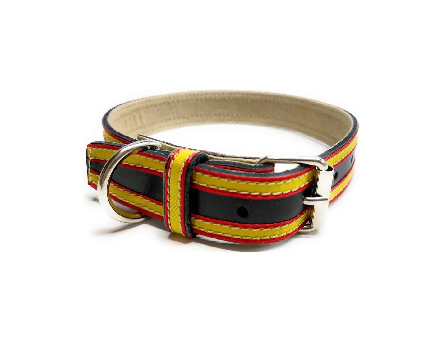 Collar de cuero para perros bandera España | Color Negro Y Marrón | Fabricado en piel de vacuno de alta calidad | Ancho de collar 2,5 cm | Altamente resistente | Parte interior con capa protectora | Tres medidas disponibles: Pequeña – válida para contorno de cuello de 26 a 36 cms. | Mediana – válida para contorno de cuello de 32 a 42 cms. | Grande - válida para contorno de cuello de 35 a 45 cms. | Para saber la talla que debes elegir y no equivocarte con el collar para tu perro, debes medirle el cuello con una cinta métrica. Es recomendable que quede una separación de 2 dedos entre la cinta métrica y el cuello del perro. Encontrarás una ilustración de como hacerlo en las fotos del collar. Para perro grande, mediano, pequeño o incluso cachorro, tan solo debes asegurarte de la medida del ancho de su cuello y recordar los dos centímetros de holgura para total comodidad del perro.