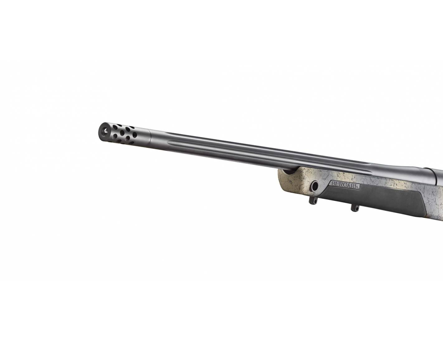 El preciso cañón flotante de Bergara de este rifle viene con un estriado profundo y un freno de boca omnidireccional, acabado en Sniper Grey Cerakote™