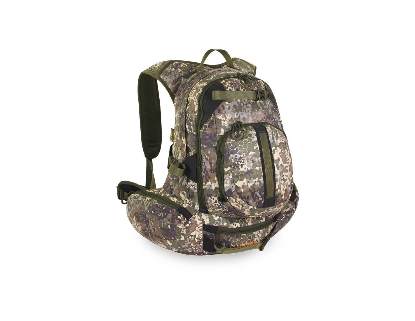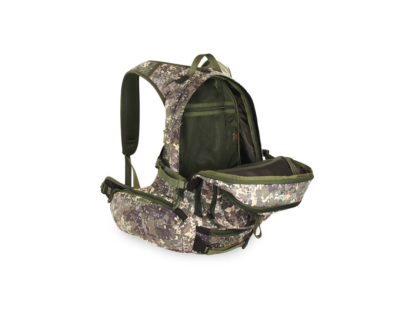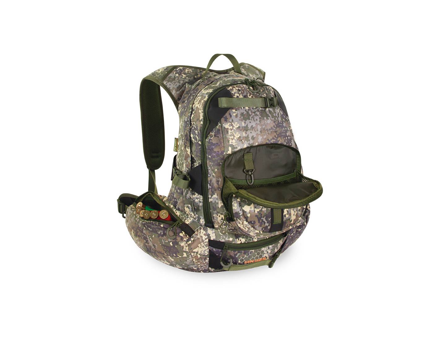 Mochila de caza Camo Suede 38L en tejido silencioso, con portafusil integrado, sistema de ventilación y múltiples compartimentos para máxima organización.